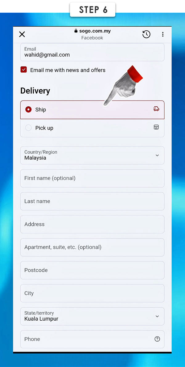 After click Checkout, choose Delivery option either shipping or self-pickup.